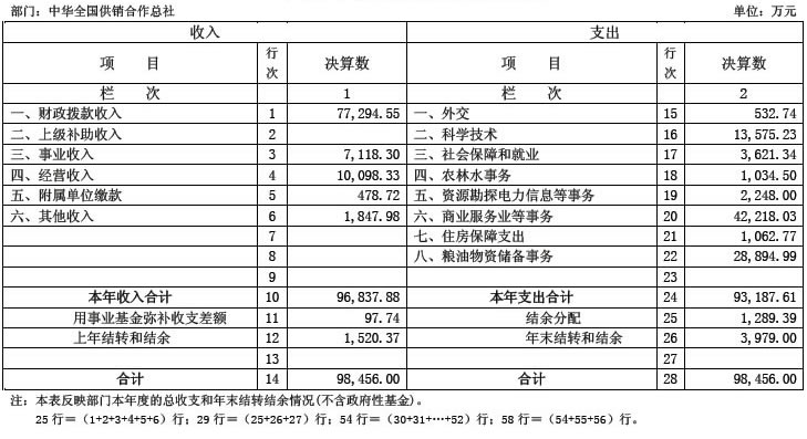 中华全国供销合作总社(以下简称供销合作总社)2013年度公共预算总收入98,456.00 万元,其中本年收入96,837.88万元;公共预算总支出98,456.00 万元,其中本年支出93,187.61 万元。