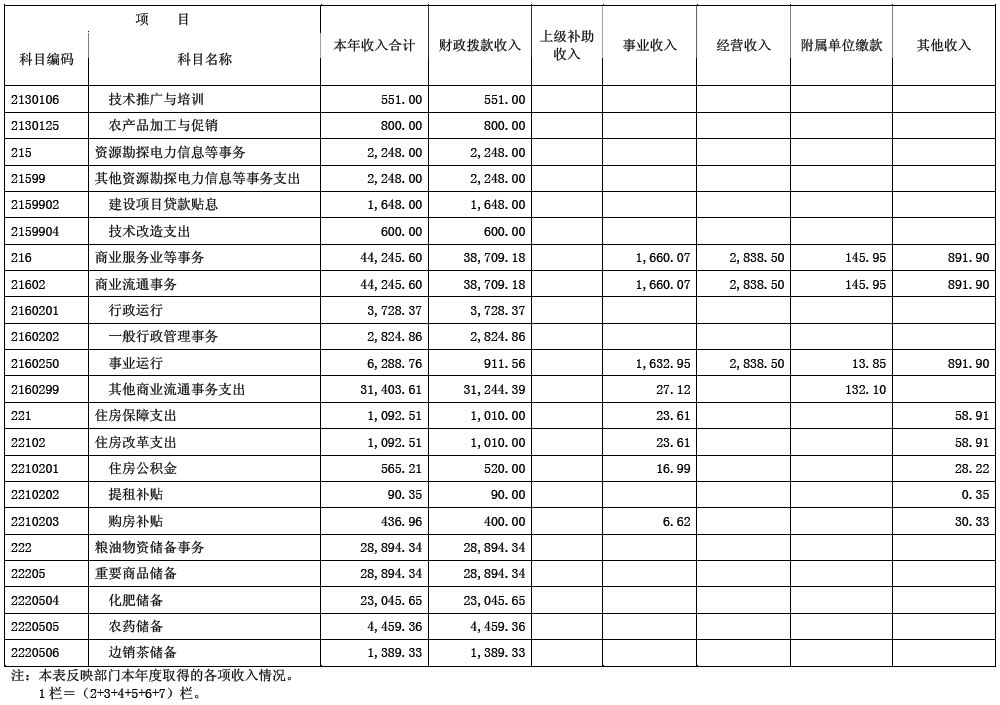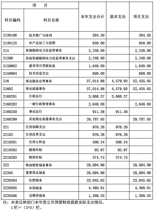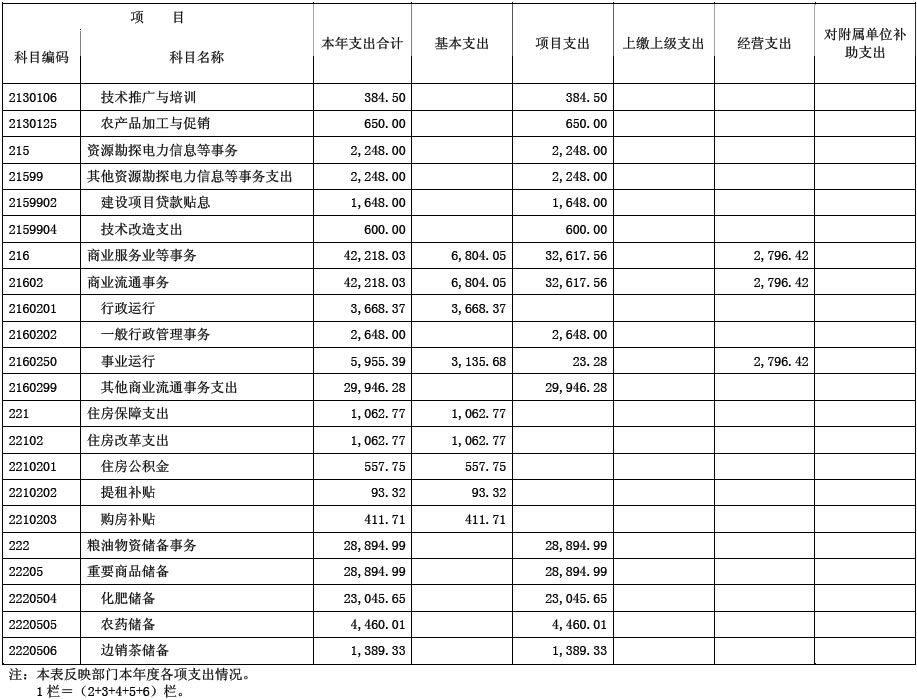 (六)商业服务业等事务(类)商业流通事务(款):指供销合作总社本级及所属事业单位用于保障机构正常运转的基本支出、为完成特定工作任务和事业发展目标发生的专项业务工作支出及基本建设项目支出。