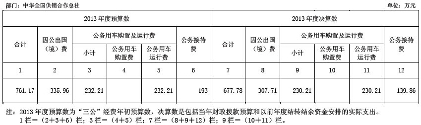 2013 年供销合作总社严格因公出国(境)事务审批,加强公务用车管理,控制公务接待规模,压缩因公出国(境)、公务用车和公务接待费用支出。因公出国(境)支出、公务用车购置及运行费支出、公务接待费支出严格控制在预算范围内。