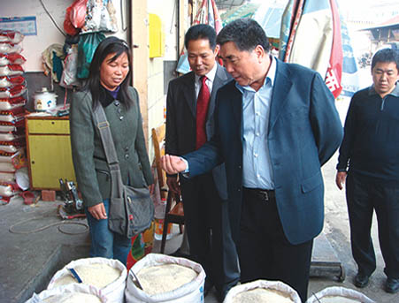 图为李成玉在南宁市供销合作社五里亭蔬菜批发市场考察