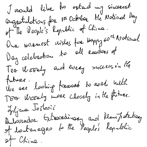 黑山共和国驻华大使Ljiljana Toskovic:“黑山共和国热烈祝贺中华人民共和国成立60周年,同样的祝福送给《茶周刊》和读者们。”
