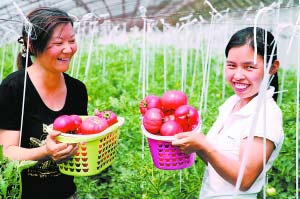 近日,果蔬大棚工作人员正在采摘“太空西红柿”准备出售。怀柔在杨宋镇建成的北京市首家太空蔬菜育种基地里,蔬菜种子搭乘“神舟”飞船上过太空,经历了特殊环境太空诱变和高新技术的培育成长,已成为观光采摘的新果品。