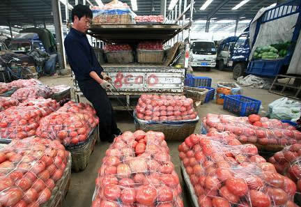 近日,在山东省济南市匡山农产品综合交易市场,一位商贩在搬运西红柿。新华社记者 郭绪雷 摄