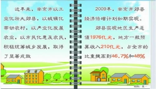 2009 年,南京市郊县经济倍增计划如期实现。郊县实现地区生产总值1976亿元,地方一般预算收入210亿元,占全市的比重分别由“十一五”初期的35.2%和 29.9%提高到46.7%和48%,接近全市一半左右。一、二、三产业结构发生新变化,2009年郊县三大产业结构为4.8:64.1:31.1。高效农业规模化不断推进。2009年,全市高效农业和渔业面积154万亩,占种养面积的三分之一左右,其中设施农业面积超过32万亩。基础设施逐步完善,实现了县县通高速公路、村村通水泥路。郊县城镇化率超过67%,比2005年提高6个百分点。农村保障体制发生新变化。新型农村养老保险参保人数达到 119.5万人,基本实现全覆盖;新型农村合作医疗参保人数达到195万人,基本实现应保尽保。