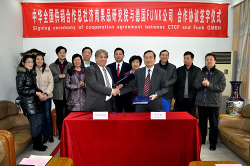 2月26日,中华全国供销合作总社济南果品研究院负责人吴茂玉与德国Funk股份公司董事长Peter Funk先生签署合作协议,Funk公司将借助济南果品研究院所属的“全国供销合作总社济南果蔬华德公司”开展食品类进出口业务。