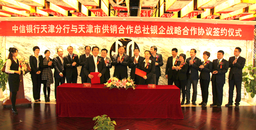 日前,天津市供销合作社与中信银行股份有限公司天津分行举行了战略合作框架协议签约仪式,开启了银企合作新模式。市供销总社党委书记边仁权、主任裴少华、副主任徐国才、副巡视员刘学武,中信银行股份有限公司天津分行行长任海东、副行长何智颖出席了仪式。
