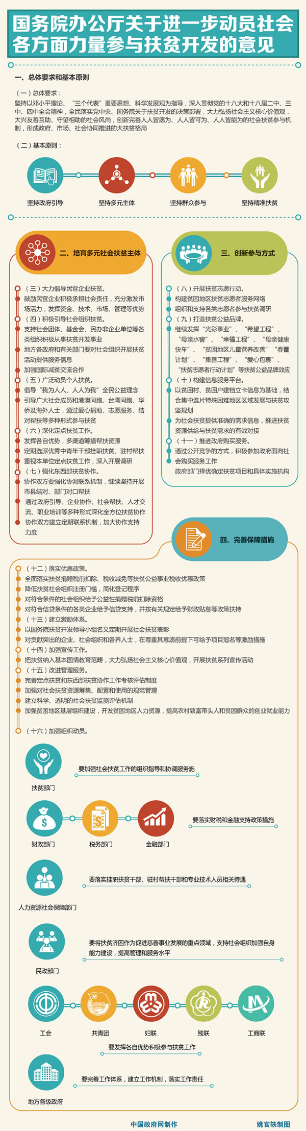 近日,国务院办公厅印发《关于进一步动员社会各方面力量参与扶贫开发的意见》,部署全面推进社会扶贫体制机制创新,进一步动员社会各方面力量参与扶贫开发,打好新时期扶贫攻坚战。