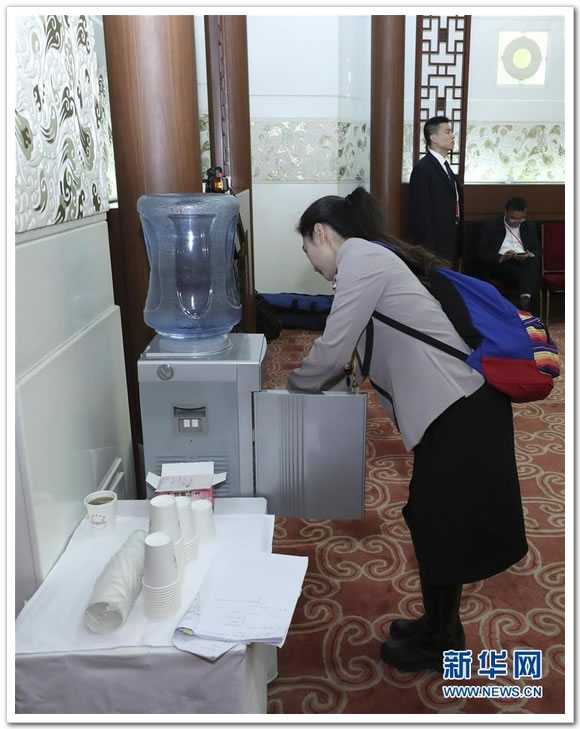 10月19日,北京人民大会堂的工作人员在记者工作间中整理水杯。新华社记者 陈建力 摄