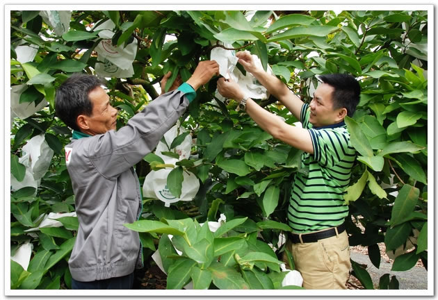 多果莲雾合作社理事长苏文林(右)手把手地传授种植技术给社员潘家炎。 本报记者 张 弛 摄