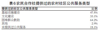 在提供农村社区公共服务方面,农民合作社积极参与基础设施建设、文化建设并且扶难济困。参与调查的农民合作社中,有47.5%的合作社提供过农村社区基础设施建设,有33.1%的合作社为农村社区文化建设作出过贡献,有64.2%的合作社为社区内的困难群众提供过帮助。但是,也应当看到,有15.1%的合作社在农村社区公共服务方面投入不足。