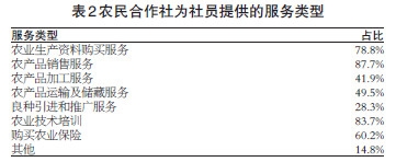 从农民合作社为社员提供的服务上看,提供农产品销售服务的合作社最多,比重为87.7%,另有83.7%的合作社为社团提供农业技术培训服务,还有78.8%的合作社为社员提供农业生产资料购买服务。从整体上看,合作社在良种引进和推广服务方面稍显不足(占比仅为28.3%)。另外,在农产品加工服务上面也略有欠缺(占比41.9%)。