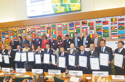 第五届全球重要农业文化遗产国际论坛上获世界重要文化遗产授牌的各国代表合影。