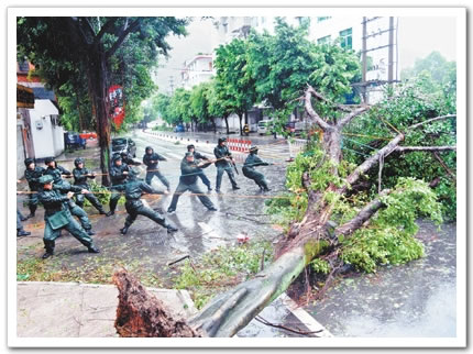 7月11日,在福建省宁德市蕉城区,武警官兵用绳索拖动倒伏树木恢复道路交通。刘 扬摄(新华社发)