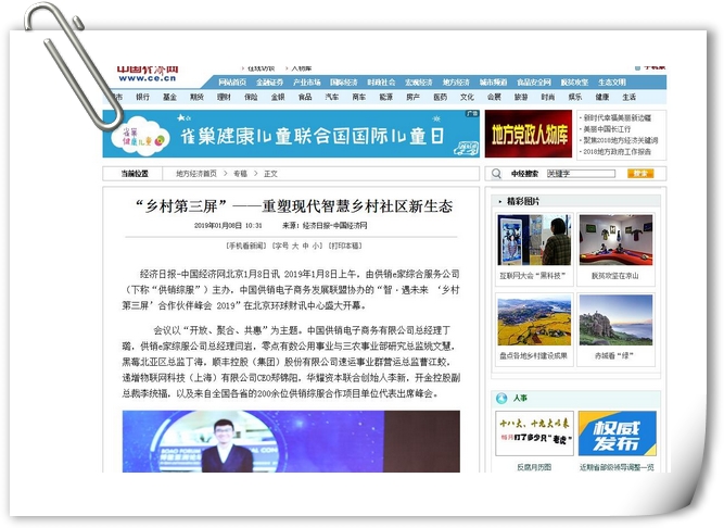 2019年1月8日上午,由供销e家综合服务公司(下称“供销综服”)主办,中国供销电子商务发展联盟协办的“智·遇未来 ‘乡村第三屏’合作伙伴峰会 2019”在北京环球财讯中心盛大开幕。