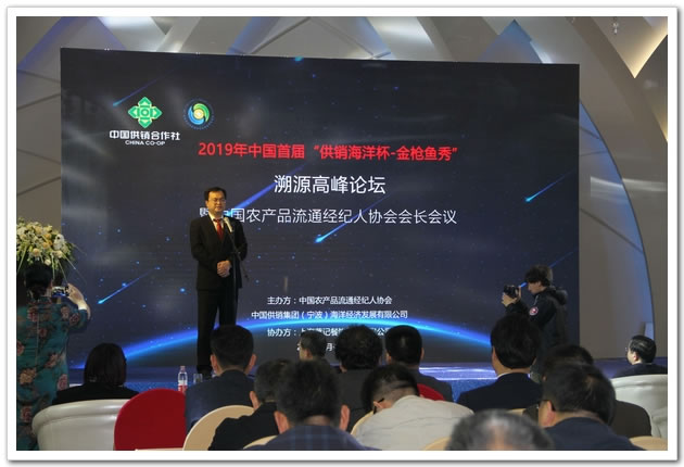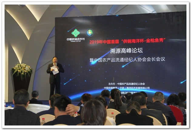 全国政协委员、中国农产品流通经纪人协会于培顺在致辞中,特地向与会者推介了宁波海洋公司的艰苦创业精神和创新开拓意识。他说,宁波海洋公司隶属全国供销合作总社,还是全国农产品流通经纪人协会的副会长单位。长期以来,供销合作社的经营业务基本在陆地上,海洋经济几乎是一片空白。在总社正确领导下,在供销集团积极推动下,张金诚同志带领他的团队九下象山海岛,冒酷暑、战台风,辟山造地,掘地建厂。仅仅用了几年的时间,他们拥有了数万吨冷库作为食品冷链运营基地;拥有了海产品深加工生物制品车间,使得水产品价值翻番;拥有宽阔的海岸线,经交通部获批待建的万吨级码头,将可供世界各地货轮装卸冷链水产品;他们还拥有“中国供销海外购”跨境电商,助推农民在田间地头实现“买全球,卖全球”。这都是他们“创业艰难百战多”的付出,才迎来“战地海货分外鲜”的芬芳。