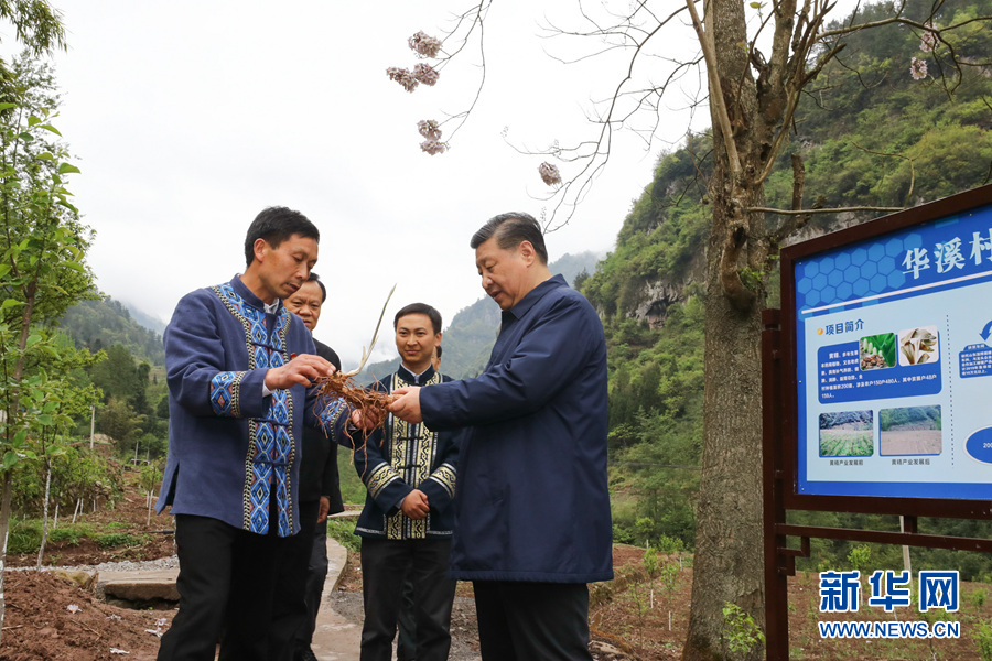 这是4月15日下午,习近平在石柱土家族自治县中益乡华溪村了解该村通过种植中药材黄精等特色经济作物带动村民脱贫的情况。 新华社记者 鞠鹏 摄