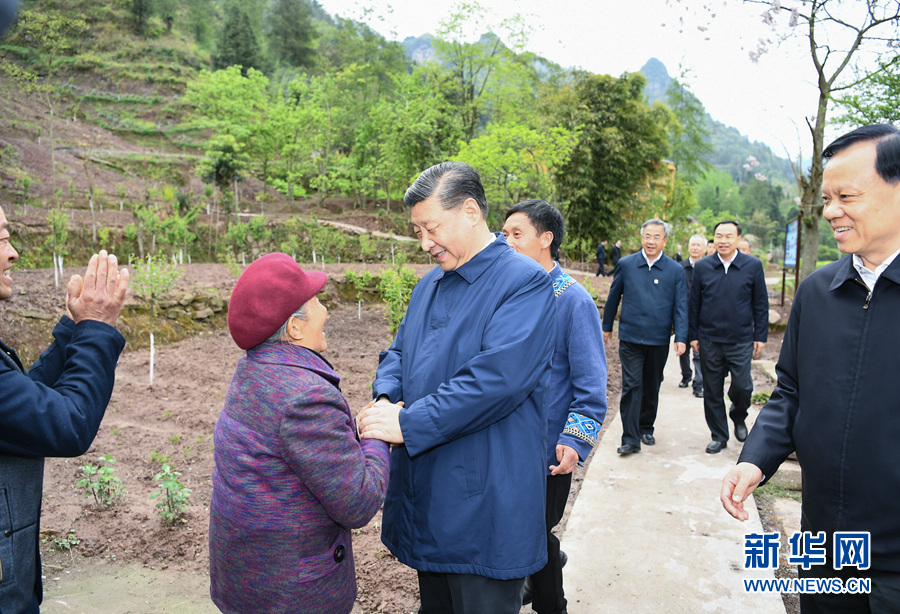 这是4月15日下午,习近平在石柱土家族自治县中益乡华溪村看望老党员、已脱贫户马培清一家。 新华社记者 谢环驰 摄