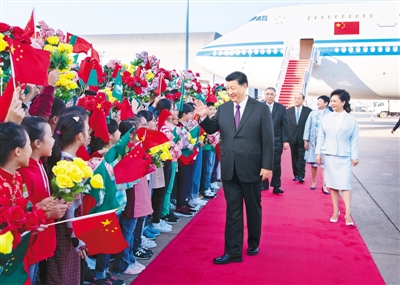 16时许,习近平乘坐的专机徐徐降落在澳门国际机场。习近平和夫人彭丽媛走出舱门,向欢迎人群挥手致意。澳门警察乐队奏响热情喜庆的欢迎曲,现场一片欢腾。舷梯旁,两名澳门少年儿童向习近平和彭丽媛献上鲜花。在澳门特别行政区行政长官崔世安和夫人霍慧芬陪同下,习近平和彭丽媛同前来迎接的人员亲切握手。数百名澳门青少年和各界群众代表挥动国旗、特别行政区区旗和鲜花,热烈欢迎习近平的到来。